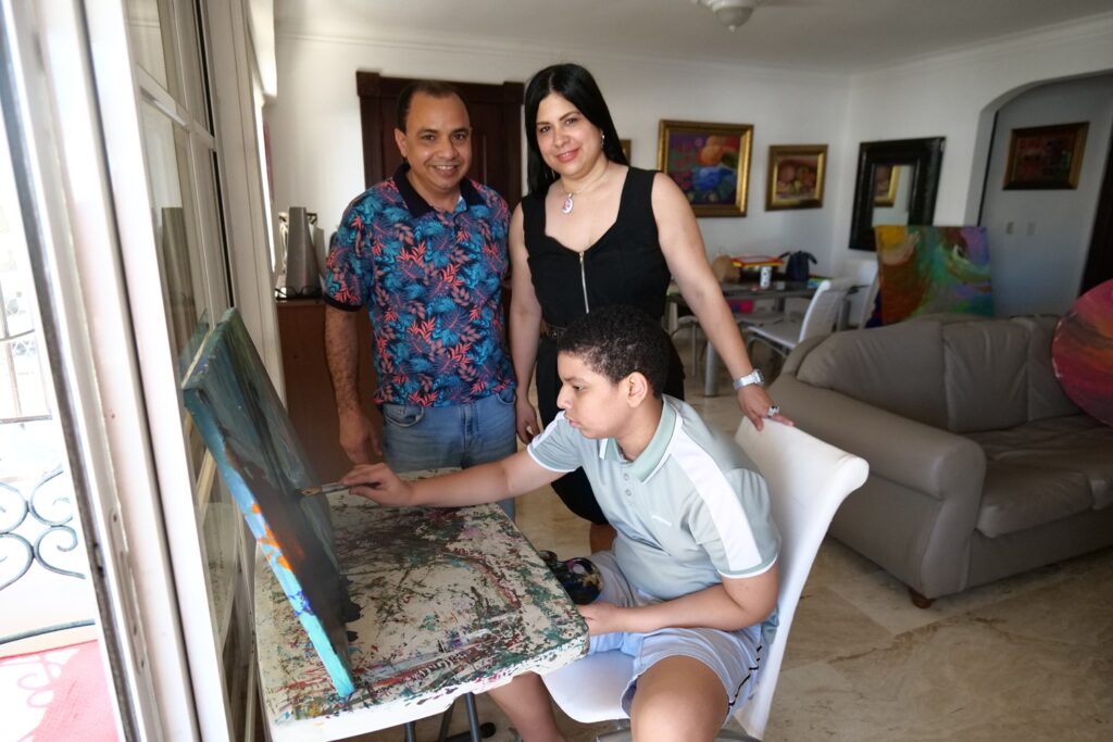 Fernando Gabriel, quien es no verbal, se ha inclinado por el arte desde los tres años. Su obra nos transporta al mar con sus especies, olas y barcas, al cielo en diferentes trajes, al amanecer, la tarde y la lluvia. Su habilidad técnica, que abarca desde el manejo del dibujo hasta la destreza motora fina, destaca su capacidad para convertir el lienzo en una ventana a su mundo interno.