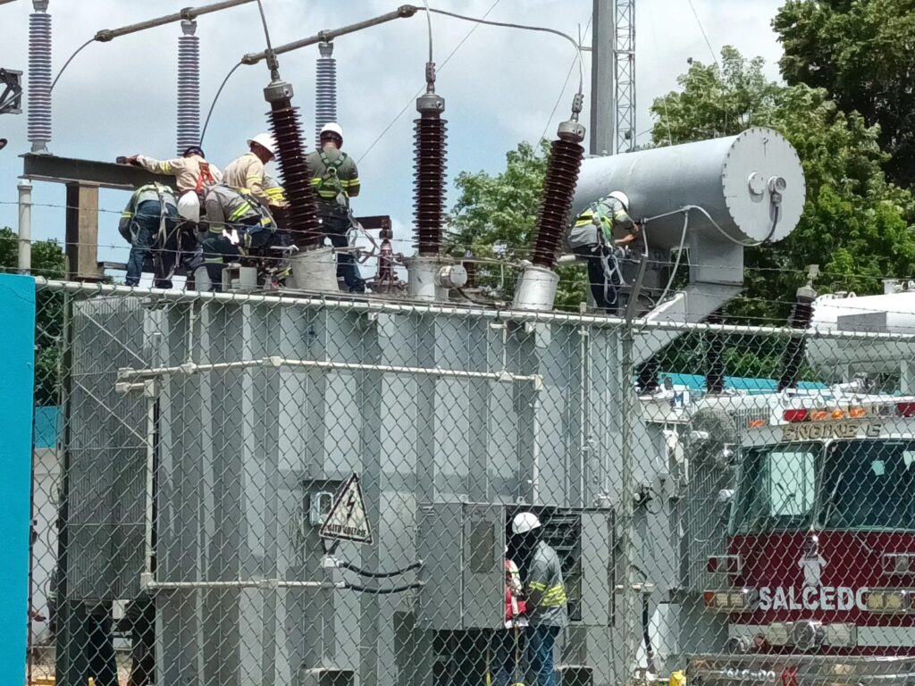 Personal calificado trabajando en uno de los transformadores que también sufrió avería en la Subestación Eléctrica de Hermana Mirabal.