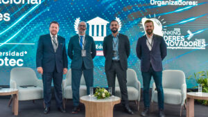 Momento en que el doctor José Alejandro Aybar M., canciller de UNICARIBE, modera el panel titulado “ Empleabilidad, Horizontes y Realidad”, en el que intervinieron, Esteban Veintimilla, Director de Producto y Empleabilidad en QS, Joaquín González del Pino, Presidente de Quixote Innovation y Pablo Arosemena, Director General de EUREKA, el centro de emprendimiento e innovación de la Universidad Espíritu Santo (UEES).