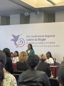 En el diálogo “Sin Barreras: Inversiones y prioridades estratégicas para reducir el impacto de la carga de cuidados en adolescentes y mujeres jóvenes”, uno de los paneles de la XVI Conferencia Regional sobre la Mujer en América Latina y el Caribe, la funcionaria señaló que, según la encuesta ENHOGAR 2021, en República Dominicana las jóvenes de 15 a 24 años realizan 50.5% de trabajo de cuidados no remunerado, más del doble que los hombres de la misma edad (20.8%).