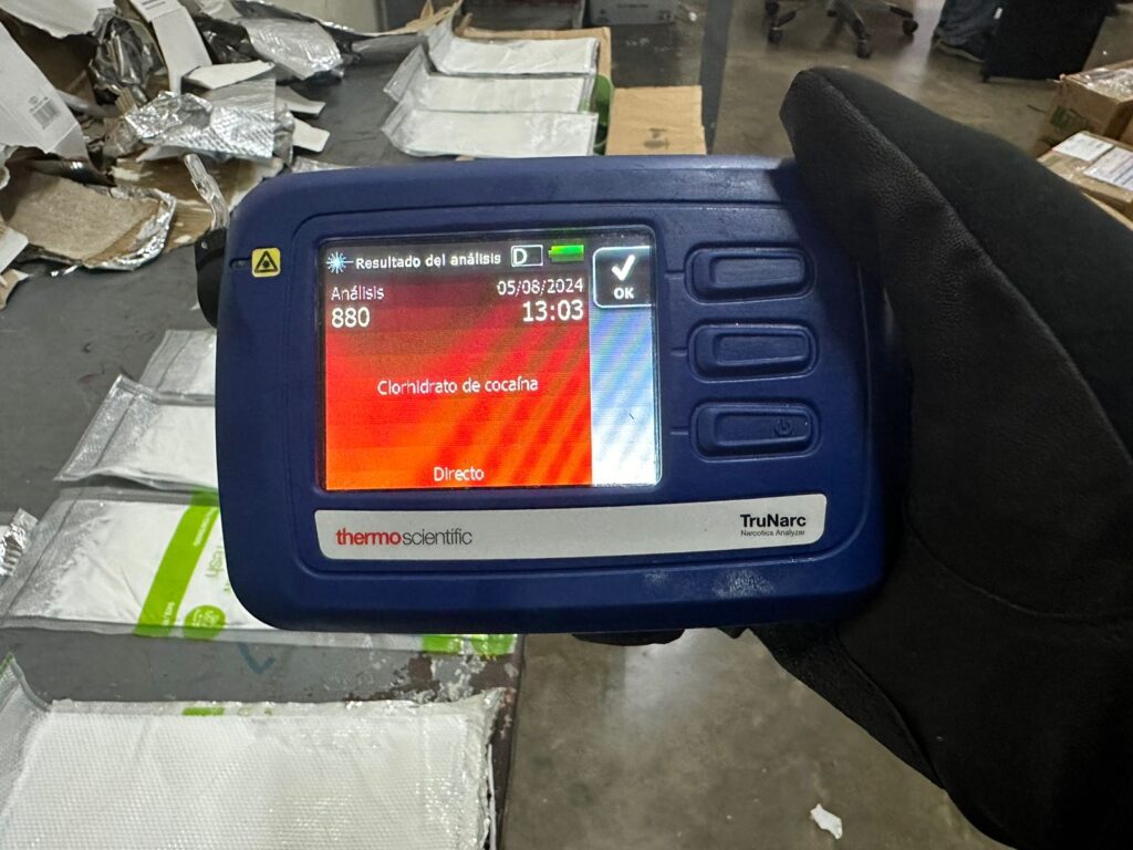 Al abrirlos, se descubrió un doble fondo, conteniendo un total de 23 láminas, envueltas en fundas plásticas y escondidas en los laterales de las cajas, con un peso aproximado a los 400 gramos de cocaína.