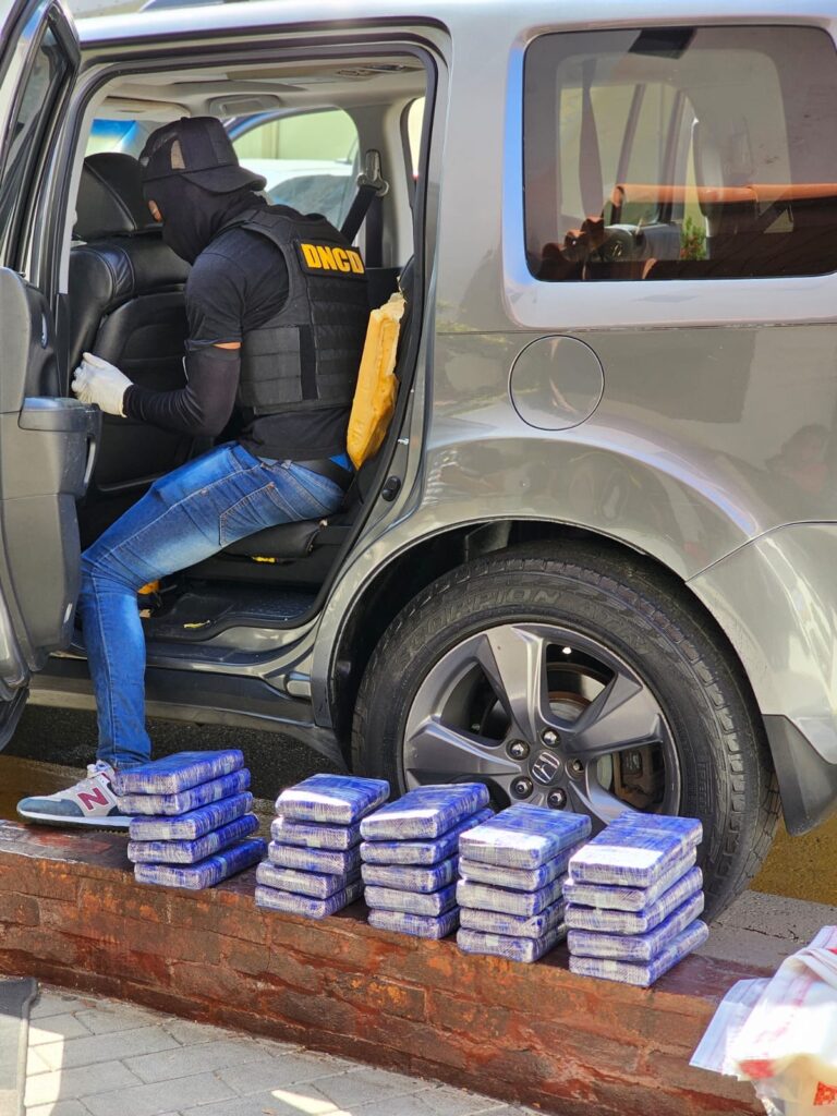Posteriormente, por instrucciones de los fiscales actuantes y por razones de seguridad, el detenido y el vehículo, fueron trasladados a la sede central de la DNCD, donde se realizó una inspección más rigurosa, encontrando encaletados en el interior de los asientos delanteros y traseros de la jeepeta, un total de 35 paquetes de una sustancia que se presume es cocaína.