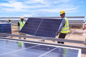 Técnicos realizan trabajos de levantamiento de paneles solares para proveer energía limpia y renovable a comunitarios de esa localidad.