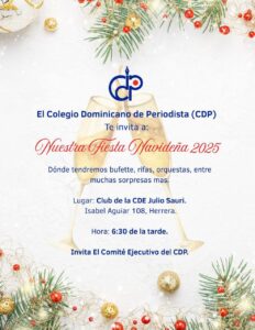 SANTO DOMINGO.- El Comité Ejecutivo Nacional del Colegio Dominicano de Periodistas (CDP) invita a sus miembros al encuentro de confraternidad navideña que se efectuará el 17 de este de diciembre.