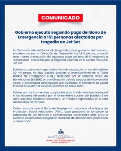 Santo Domingo, 15 de julio de 2025. – La Comisión Interinstitucional designada por el gobierno dominicano y encabezada por la Dirección de Desarrollo Social Supérate, dio a conocer este martes de la ejecución del segundo pago del Bono de Emergencia a familias afectadas por tragedia Jet Set.