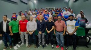 La imagen muestra al presidente de la Asociación de Softbol de la provincia Sánchez Ramírez, Fabio de León Sánchez (centro), junto a los delegados de los equipos convocados al XV torneo de softbol empresarial en la versión 2025. (Fuente externa)